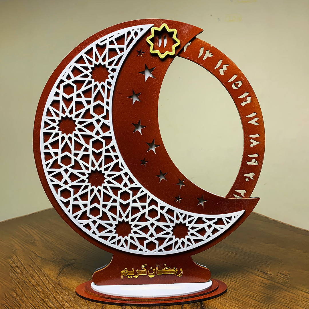 Decorative MDF wooden Ramadan calendar tabletop piece with deco paints and protective lacquer spray for a glossy, durable, and elegant finish.