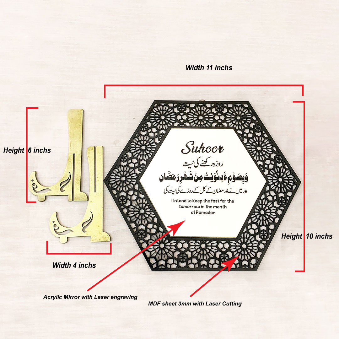 Each plaque features a premium acrylic mirror surface with precise laser engraving, framed with delicate Islamic patterns. The base is made from 3mm MDF wood, expertly laser-cut for a clean and sturdy finish. After cutting, the stand is carefully treated with wood primer, followed by two coats of high-quality deco paint, and finally sealed with two layers of lacquer spray to provide a glossy shine and long-lasting paint protection.