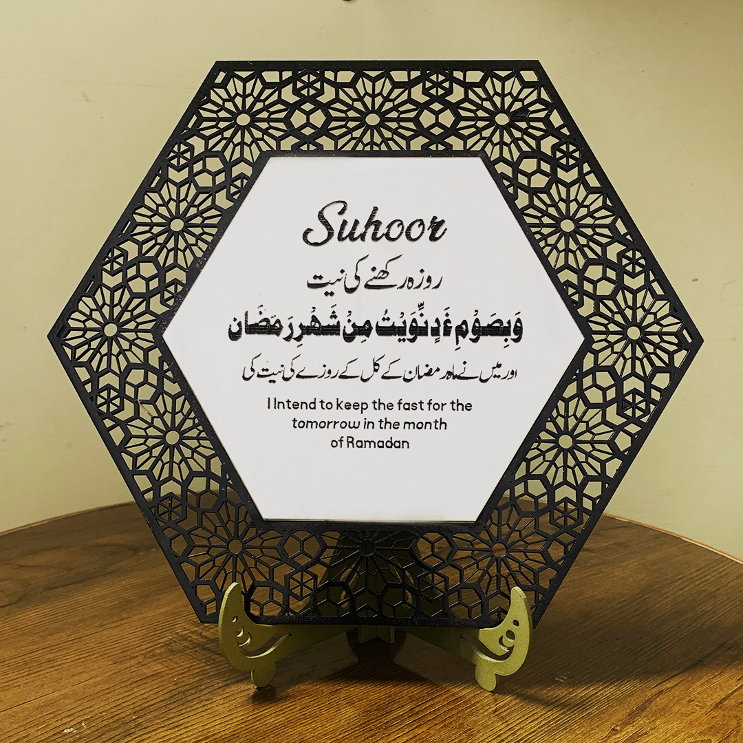 Bring the spirit of Ramadan into your home with this beautifully crafted Set of 2 Ramadan Duas – Suhoor & Iftar plaques. Designed as a timeless Islamic décor piece, these elegant signs display the dua to begin the fast and the dua to break the fast, reminding your family of the blessings of every day in Ramadan.